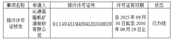沁源縣隆帆礦渣制砂有限公司排污許可證重新申領核發公告