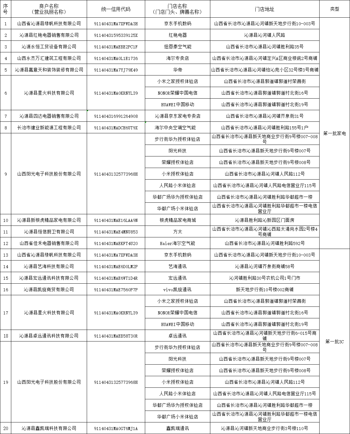 附件:沁源縣消費品以舊換新第一批擬參與主體公示名單
